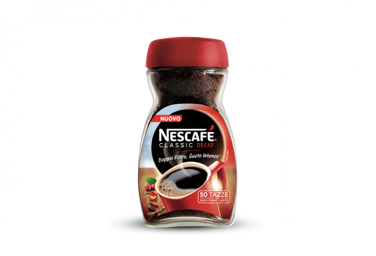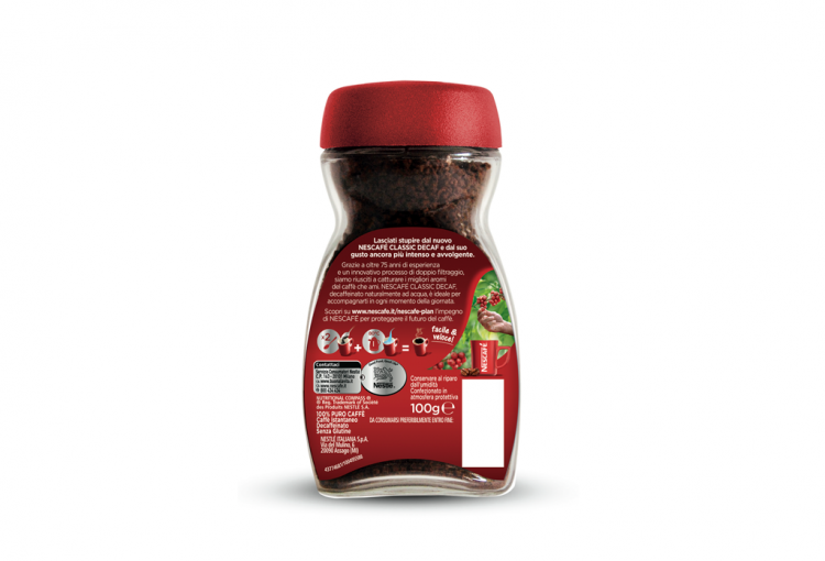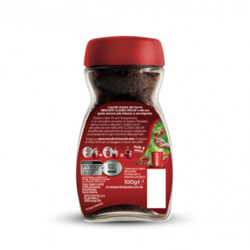 Grazie a oltre 75 anni di esperienza e un innovativo processo di doppio filtraggio, siamo riusciti a catturare i migliori sapori e aromi del caffè che ami.NESCAFÉ CLASSIC DECAF è un caffè dal gusto corposo ed avvolgente, che offre tutto l’aroma originale di NESCAFÉ CLASSIC senza rinunce. Sai come si ottiene il caffè solubile decaffeinato? NESCAFÉ estrae la caffeina dai chicchi verdi di caffè, prima che vengano tostati, attraverso un procedimento che utilizza l’acqua. Il risultato ottenuto è una miscela solubile unica, dal gusto intenso, ideale per accompagnarti in ogni momento della tua giornata.